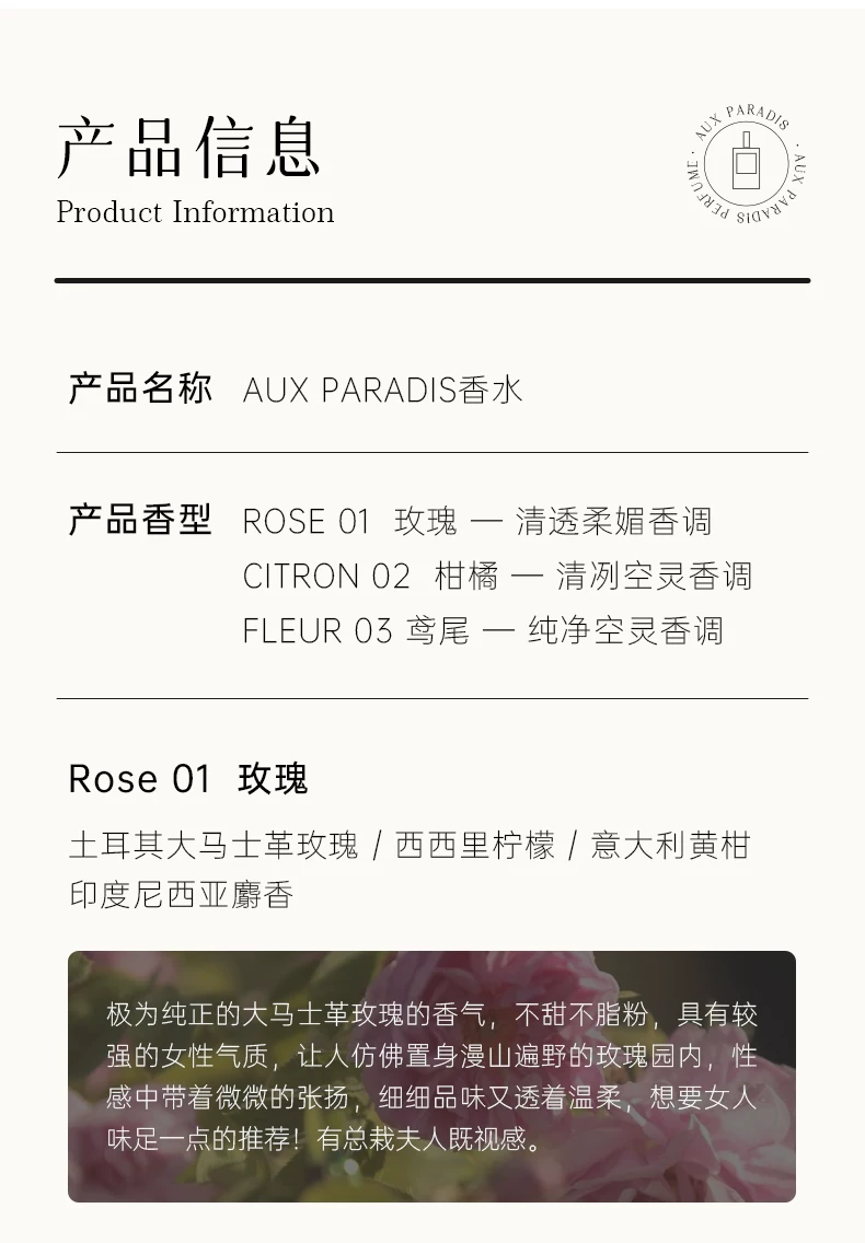 AUX PARADIS限定自然持久留香女士香水高端質感清新花香調優雅香
